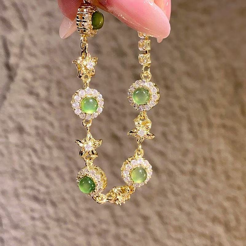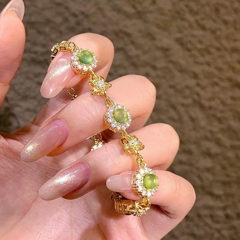 levate your jewelry stack with this Green Jade Star Gold Bracelet—a blend of timeless elegance and celestial charm. Crafted with 18K gold-plated metal, this delicate chain features round green jade beads encircled by a halo of sparkling cubic zirconia, paired with intricately designed gold star charms for a whimsical touch. The adjustable clasp ensures a perfect fit for any wrist size, making it ideal for daily wear, special occasions, or gifting to loved ones. The lush green jade hue adds a pop of natural beauty to any outfit, while the zircon detailing delivers lasting shine and sophistication. Whether worn alone as a statement piece or layered with other bracelets, this jade star bracelet brings a touch of luxury and celestial magic to your look.
